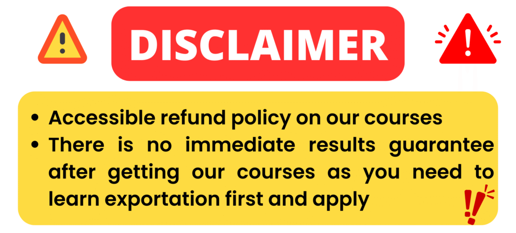 “This course provides information about exporting. It does not guarantee export success. Exporting involves risks, and your results may vary. We are not responsible for any losses you may incur. Success in the export business depends on multiple factors including market conditions, individual effort, and available resources..”
